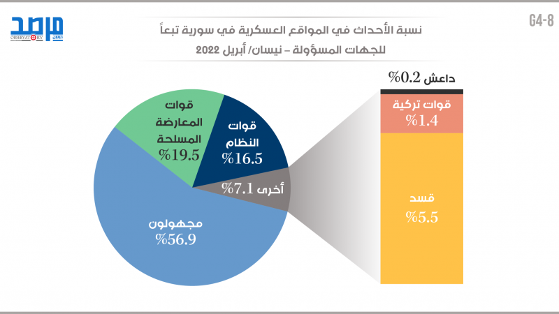 نيسان 2022.. نسبة الأحداث في المواقع العسكرية في سورية تبعًا للجهات المسؤولة