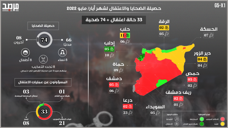 حصيلة الضحايا والمعتقلين السوريين خلال أيار 2022