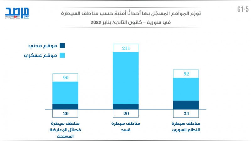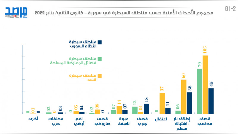 مجموع الأحداث الأمنية حسب مناطق السيطرة في سورية (كانون الثاني 2022)