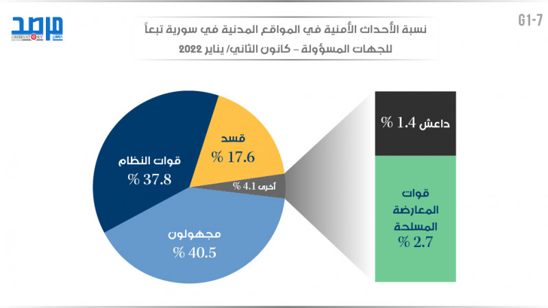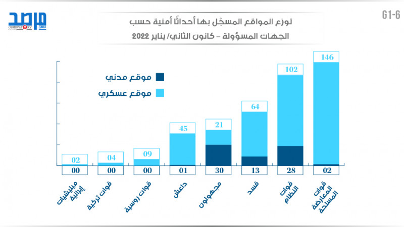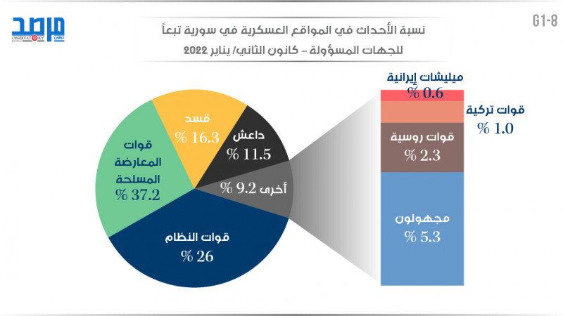 نسبة الأحداث في المواقع العسكرية في سورية تبعًا للجهات المسؤولة (كانون الثاني 2022)