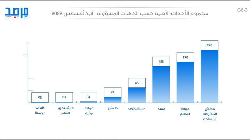 مجموع الأحداث الأمنية حسب الجهات المسؤولة في سورية (آب 2022)