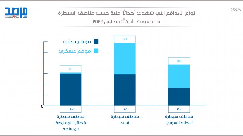 توزع المواقع التي شهدت أحداثًا أمنية حسب مناطق السيطرة في سورية (آب 2022)