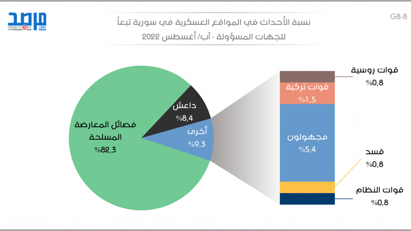 نسبة الأحداث في المواقع العسكرية في سورية تبعًا للجهات المسؤولة (آب 2022)