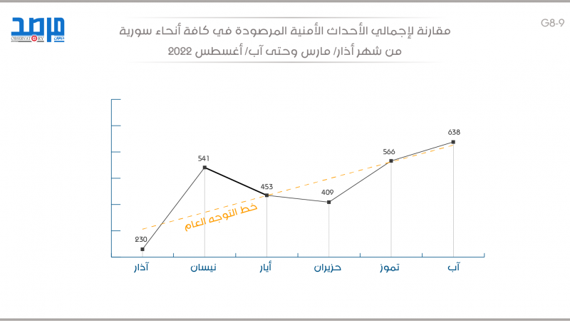 مقارنة لإجمالي الأحداث الأمنية المرصودة في سورية من شهر آذار حتى آب 2022