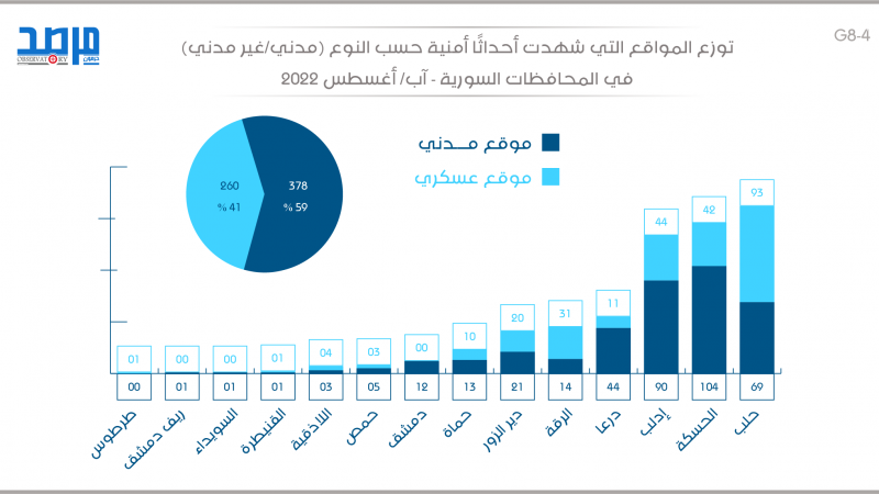 آب 2022.. توزع المواقع التي شهدت أحداثًا أمنية حسب النوع (مدني/غير مدني) في المحافظات السورية
