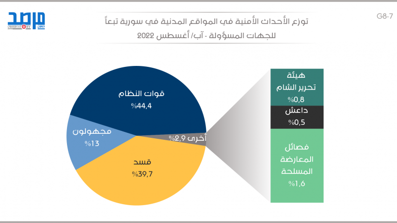 توزع الأحداث الأمنية في المواقع المدنية في سورية تبعًا للهجمات المسؤولة (آب 2022)