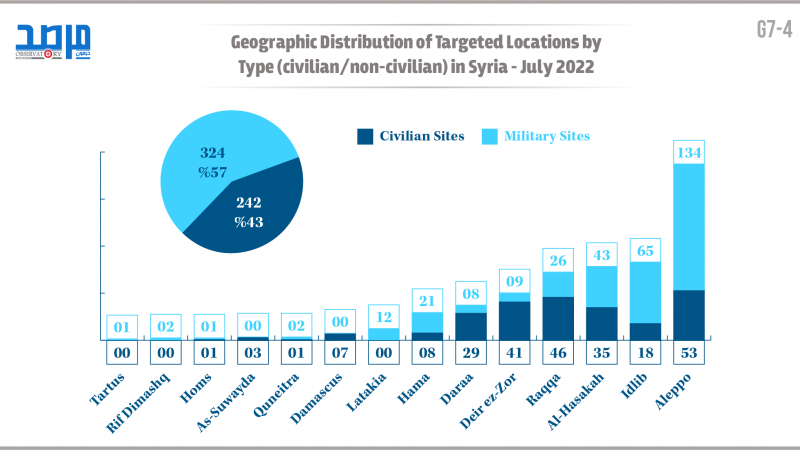 Geographic Distribution of Targeted Locations by Type (civilian- non civilian) in syria- july 2022