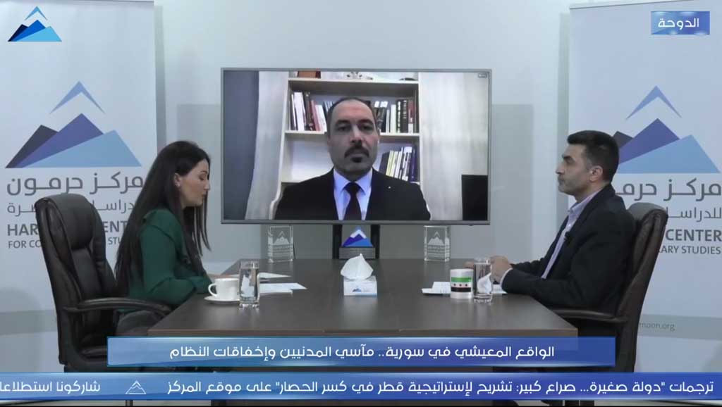 عقد مركز حرمون للدراسات المعاصرة، عبر البث المباشر، أمس الثلاثاء 22 كانون الأول/ ديسمبر 2020، ندوة بعنوان: “الواقع المعيشي في سورية.. مآسي المدنيين وإخفاقات النظام”، شارك فيها: عبد الناصر الجاسم، أستاذ إدارة الأعمال في جامعة ماردين، وعمر إدلبي، مدير مكتب الدوحة لمركز حرمون، وأدارتها الإعلامية السورية ناديا كمال الدين.