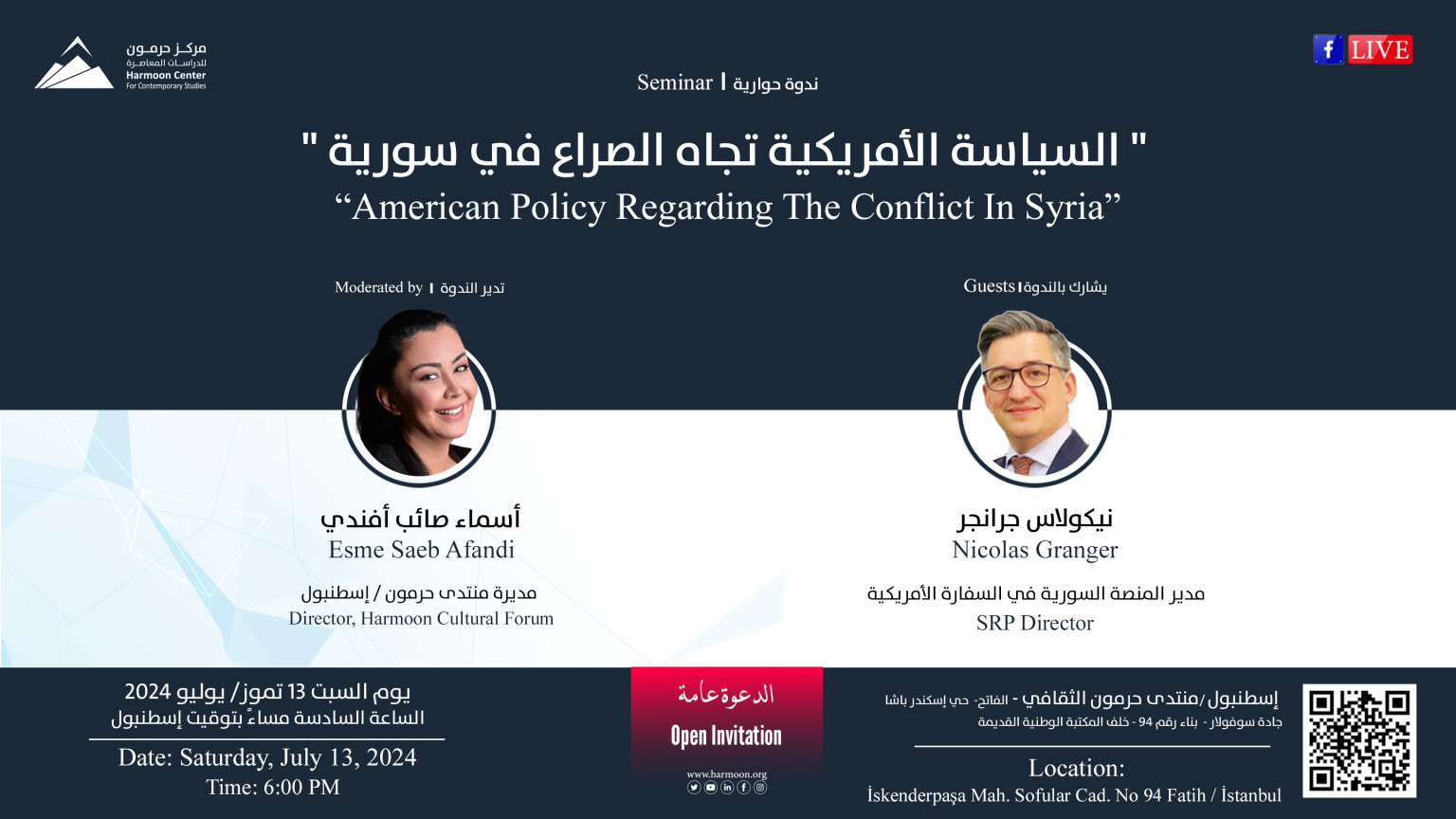 يعقد مركز حرمون للدراسات المعاصرة، يوم السبت 13 تموز/ يوليو 2024، الساعة 6 مساءً بتوقيت إسطنبول، ندوة حوارية بعنوان “السياسة الأميركية تجاه الصراع في سورية“، يشارك فيها نيكولاس جرانجر، مدير المنصة السورية في السفارة الأميركية (SRP)، وتديرها أسماء صائب أفندي، مديرة منتدى حرمون الثقافي في إسطنبول.