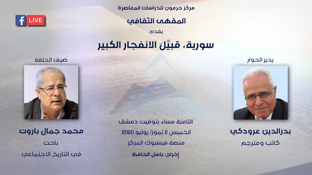 حلّ الباحث السوري محمد جمال باروت ضيفًا على الحلقة الثانية من برنامج "المقهى الثقافي"، الذي يعقده مركز حرمون للدراسات المعاصرة، ويديره بدر الدين عرودكي.