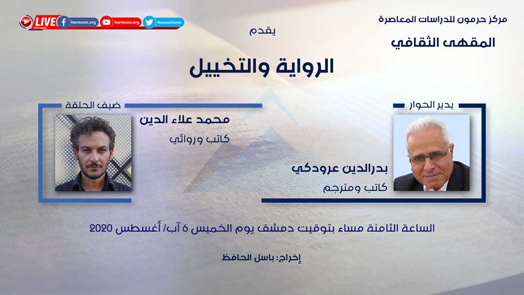 يستضيف برنامج "المقهى الثقافي" التابع لمركز حرمون، والذي يُشرف عليه ويديره بدر الدين عرودكي، في 6 آب/ أغسطس 2020، الروائي المصري محمد علاء الدين.