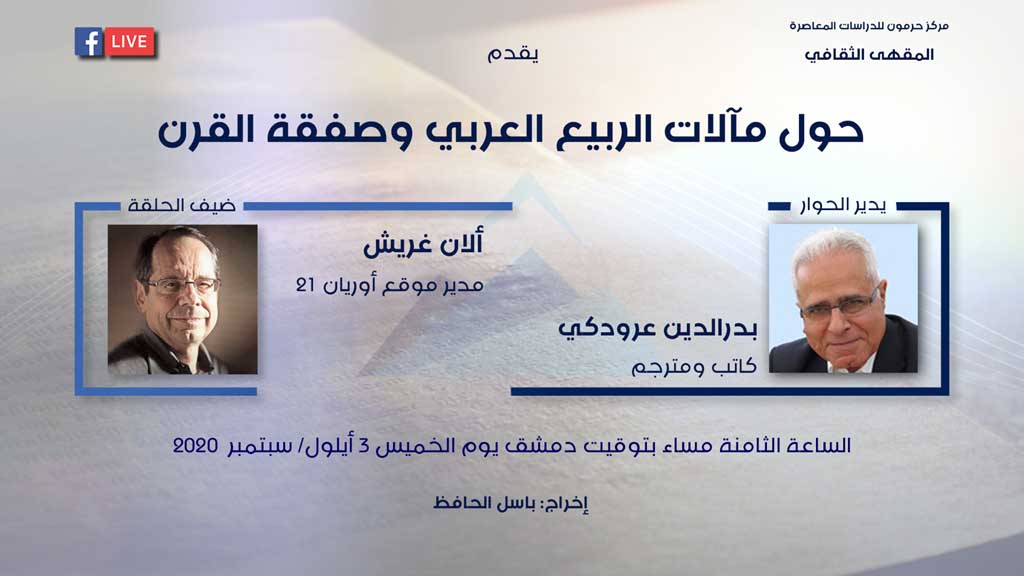 الكاتب والصحافي الفرنسي ألان غريش ضيف الحلقة المقبلة من برنامج "المقهى الثقافي" يُشرف عليه ويديره بدر الدين عرودكي الخميس 3/ 9/ 2020 الثانة مساءً بتوقيت دمشق