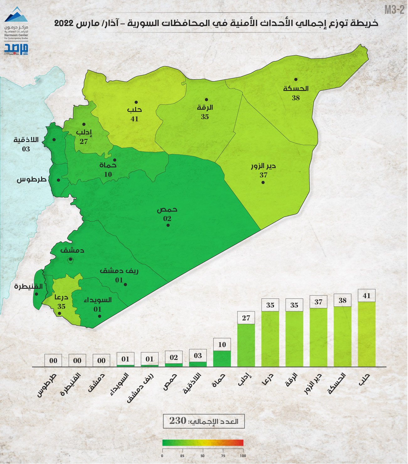 آذار 2022.. خريطة توزع الأحداث الأمنية في المحافظات السورية نشر في 17 نيسان/أبريل ,2022 مشاركة مشاركة مشاركة المقال Facebook Twitter Copy Link Print مشاركة مقالات أخرى للكاتب شرعنة عنف الدولة في سورية أزمة اللاجئين السوريين وتهديدات الأمن العالمي (دراسة حالة ألمانيا) تصعيد أزمة اللاجئين السوريين في لبنان: الدوافع والمآلات اترك تعليقا اترك تعليقاً إلغاء الردلن يتم نشر عنوان بريدك الإلكتروني. الحقول الإلزامية مشار إليها بـ *التعليق * الاسم * البريد الإلكتروني * احفظ اسمي، بريدي الإلكتروني، والموقع الإلكتروني في هذا المتصفح لاستخدامها المرة المقبلة في تعليقي. المقال السابق آذار 2022.. مقارنة لأبرز الأحداث الأمنية المرصودة في سورية المقال التالي آذار 2022.. خريطة توزع الضحايا المدنيين في المحافظات السورية