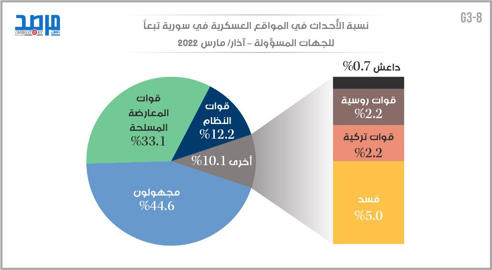 آذار 2022.. نسبة الأحداث في المواقع العسكرية في سورية تبعًا للجهات المسؤولة