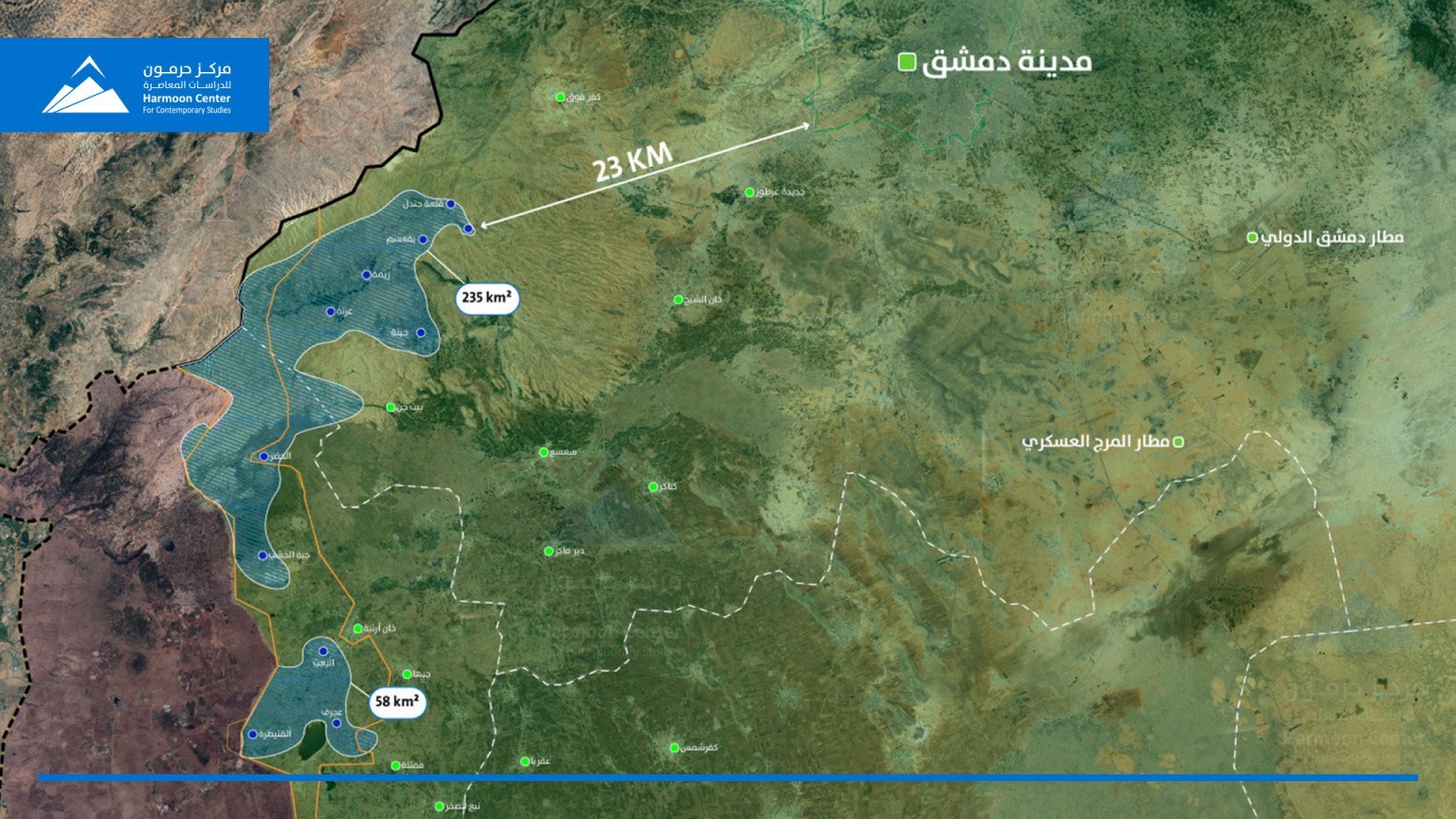 خلال الأسبوع الأول من سقوط نظام الأسد، تقدّمت القوات الإسرائيلية من أربعة محاور مختلفة، امتدت من حوض اليرموك ووصلت إلى قمة جبل الشيخ، وتوضح (خريطة رقم 1) واقع السيطرة والمحاور التي تقدمت منها إسرائيل، مع المساحات التي سيطرت عليها حتى تاريخ 24  كانون الأول 2024، وتوضّح (خريطة رقم 2) واقع السيطرة الحالي، وقد تضمّن انسحاب إسرائيل من منطقة حوض اليرموك، وتوسعها في المحاور الشمالية، وارتفعت مساحة الرقعة التي توغلت فيها إسرائيل، من 303 كلم مربع، إلى 346 كلم مربع.