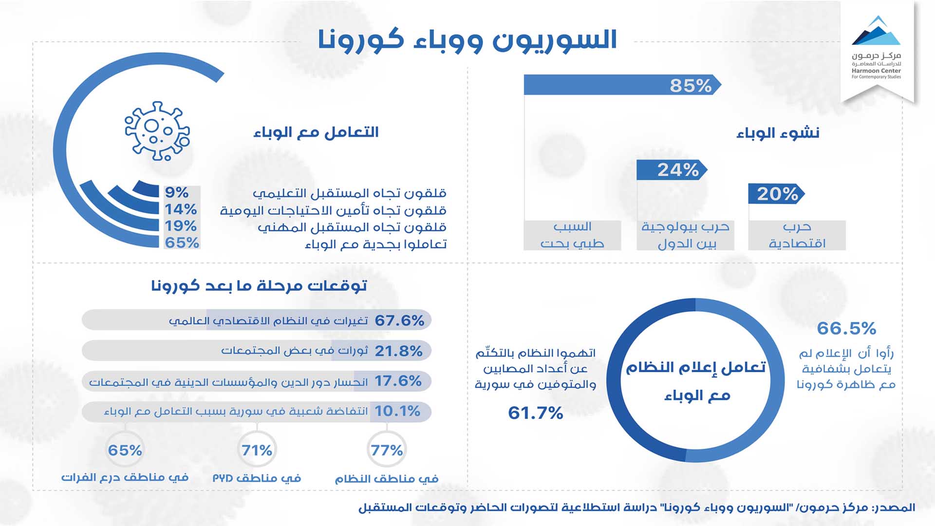 نتائج دراسة استطلاعية للعلاقة بين التصورات والسلوكات والتوقعات الخاصة بالسوريين، تجاه هذا الفيروس، أجراها مركز حرمون للدراسات المعاصرة