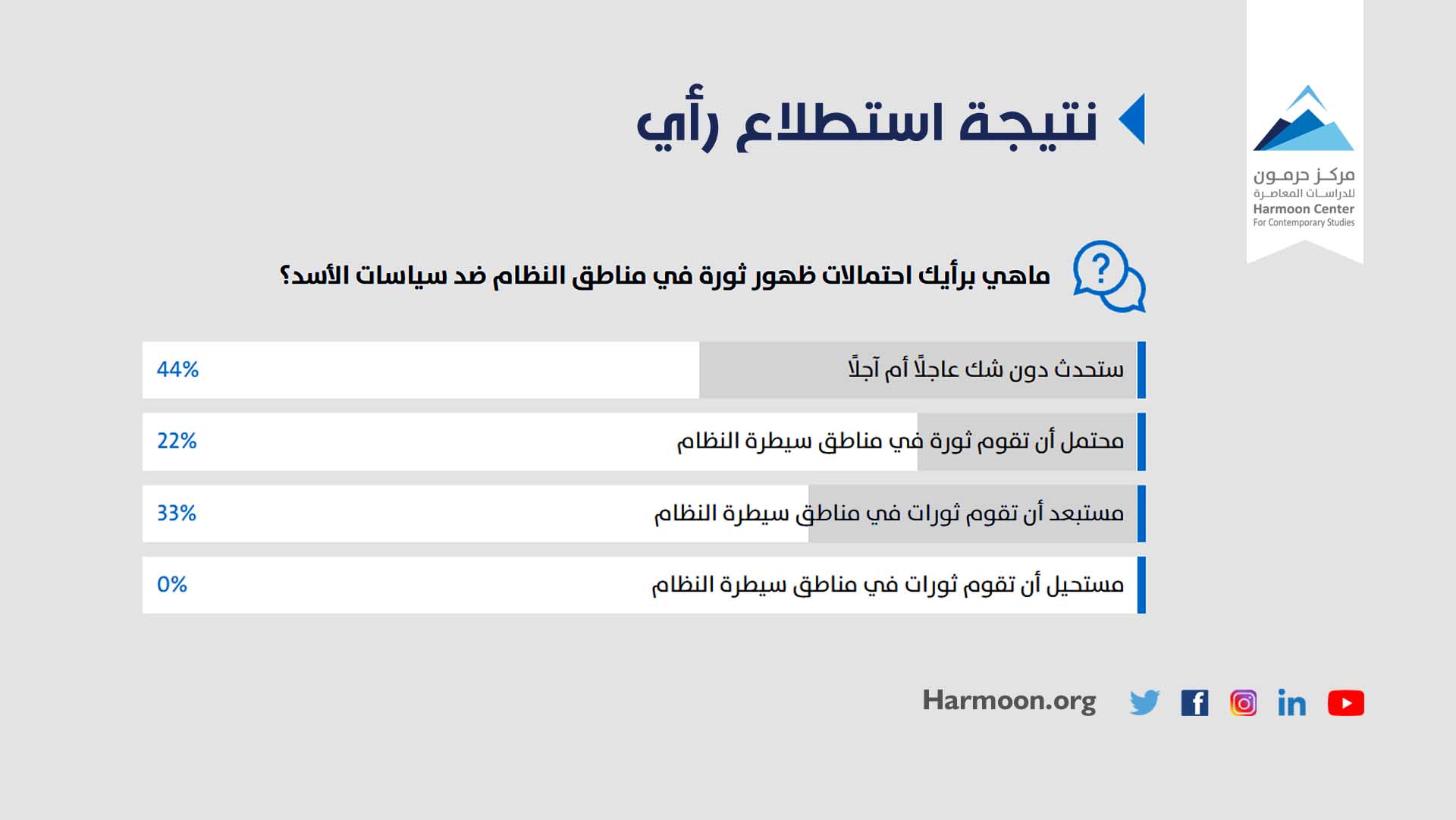 يرى 44% من المستطلعين أنه ستحدث ثورة في مناطق النظام ضد سياسات الأسد عاجلًا أم آجلًا