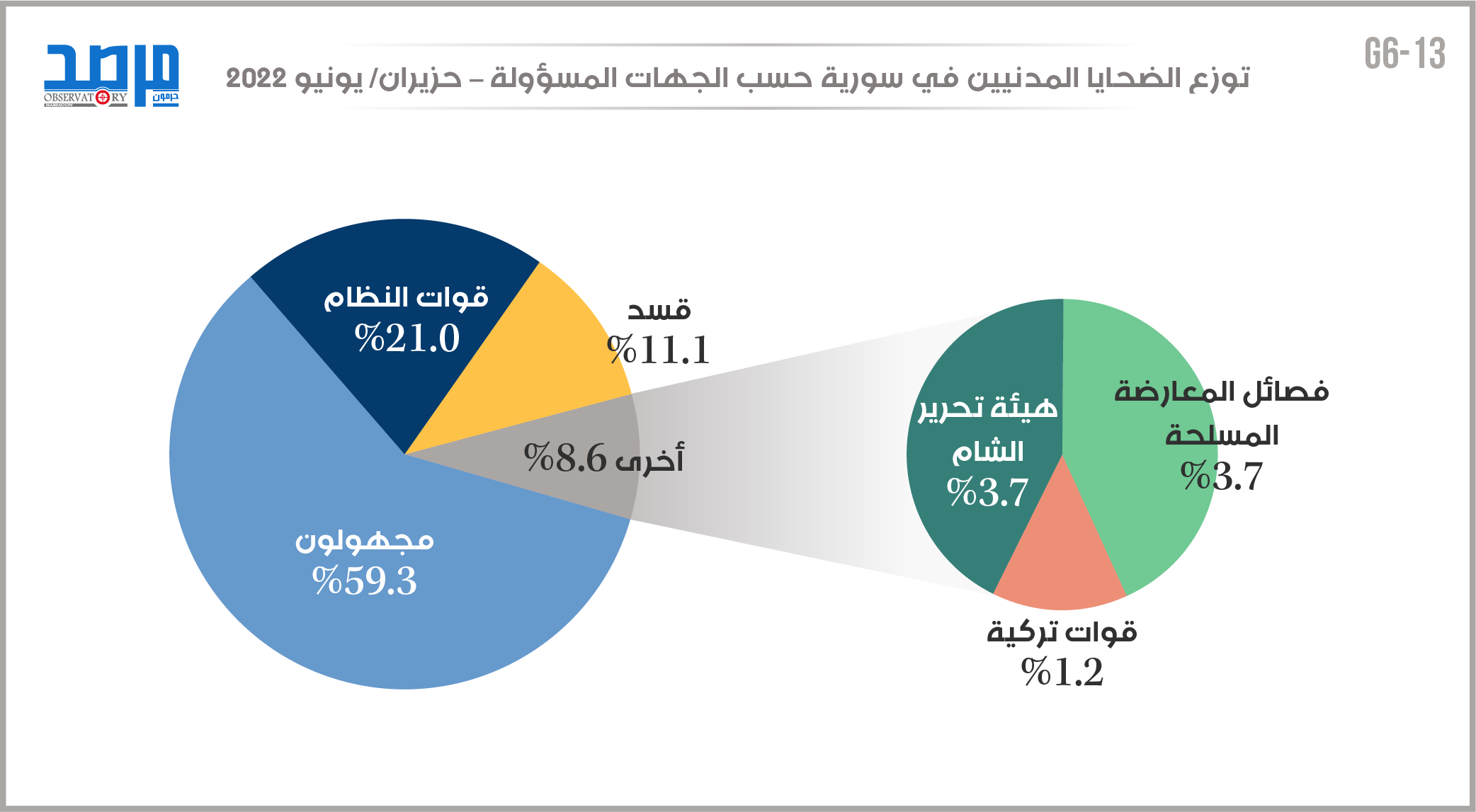 توزع الضحايا المدنيين في سورية حسب الجهات المسؤولة (حزيران 2022) نشر في 19 آب/أغسطس ,2022 مشاركة مشاركة مشاركة المقال Facebook Twitter Copy Link Print مشاركة مقالات أخرى للكاتب شرعنة عنف الدولة في سورية أزمة اللاجئين السوريين وتهديدات الأمن العالمي (دراسة حالة ألمانيا) تصعيد أزمة اللاجئين السوريين في لبنان: الدوافع والمآلات اترك تعليقا اترك تعليقاً إلغاء الردلن يتم نشر عنوان بريدك الإلكتروني. الحقول الإلزامية مشار إليها بـ *التعليق * الاسم * البريد الإلكتروني * احفظ اسمي، بريدي الإلكتروني، والموقع الإلكتروني في هذا المتصفح لاستخدامها المرة المقبلة في تعليقي. المقال السابق توزع الضحايا المدنيين في سورية حسب الفئات المجتمعية (حزيران 2022) المقال التالي مقارنة لأعداد الضحايا في سورية حسب الفئات من شهر يناير حتى حزيران 2022
