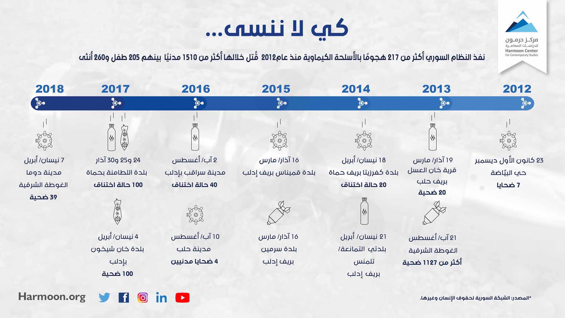 نفّذ النظام السوري أكثر من 217 هجومًا بالأسلحة الكيميائية منذ عام 2010، قُتل خلالها أكثر من 1510 مدنيًا.