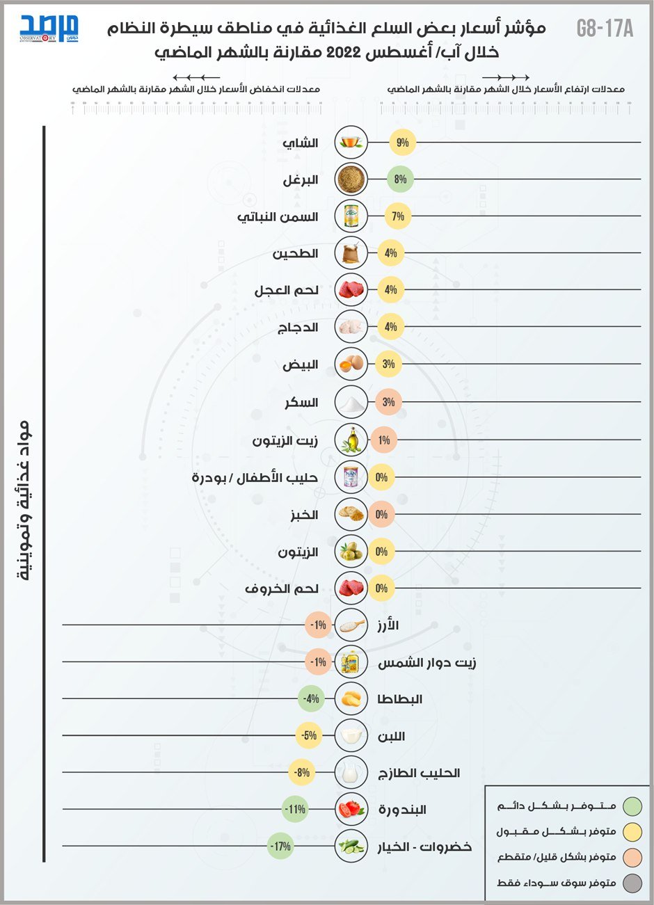 مؤشر أسعار بعض السلع الغذائية في مناطق سيطرة النظام السوري (آب 2022) نشر في 23 أيلول/سبتمبر ,2022 مشاركة مشاركة مشاركة المقال Facebook Twitter Copy Link Print مشاركة مقالات أخرى للكاتب شرعنة عنف الدولة في سورية أزمة اللاجئين السوريين وتهديدات الأمن العالمي (دراسة حالة ألمانيا) تصعيد أزمة اللاجئين السوريين في لبنان: الدوافع والمآلات اترك تعليقا اترك تعليقاً إلغاء الردلن يتم نشر عنوان بريدك الإلكتروني. الحقول الإلزامية مشار إليها بـ *التعليق * الاسم * البريد الإلكتروني * احفظ اسمي، بريدي الإلكتروني، والموقع الإلكتروني في هذا المتصفح لاستخدامها المرة المقبلة في تعليقي. المقال السابق مؤشر أسعار مصادر الطاقة وبعض الخدمات الأساسية في سورية حسب مناطق السيطرة (آب 2022) المقال التالي مؤشر أسعار مصادر الطاقة وبعض الخدمات الأساسية في مناطق النظام (آب 2022)