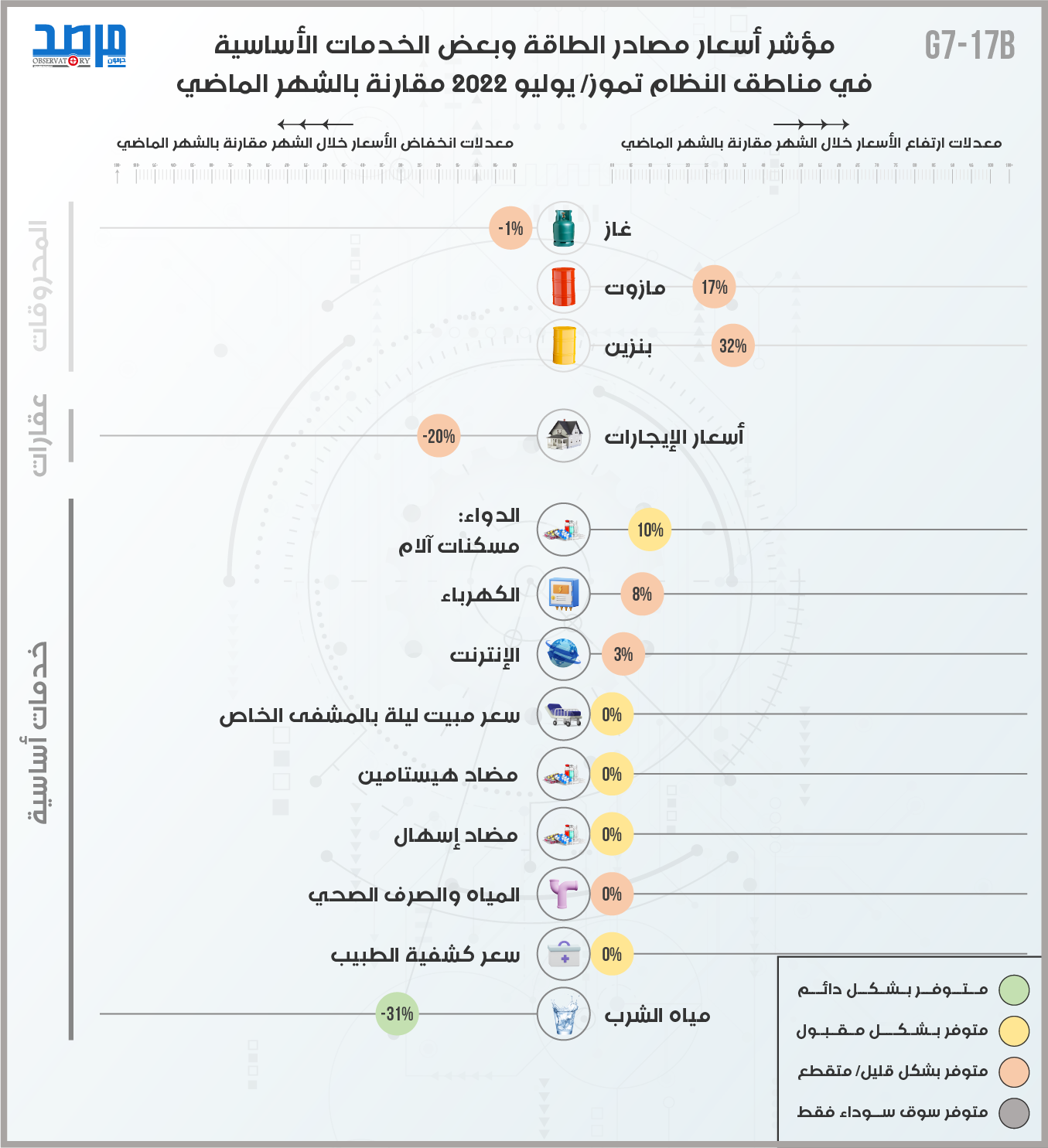 مؤشر أسعار مصادر الطاقة وبعض الخدمات الأساسية في مناطق النظام (تموز 2022) مقارنة بالشهر الماضي نشر في 2 أيلول/سبتمبر ,2022 مشاركة مشاركة مشاركة المقال Facebook Twitter Copy Link Print مشاركة مقالات أخرى للكاتب شرعنة عنف الدولة في سورية أزمة اللاجئين السوريين وتهديدات الأمن العالمي (دراسة حالة ألمانيا) تصعيد أزمة اللاجئين السوريين في لبنان: الدوافع والمآلات اترك تعليقا اترك تعليقاً إلغاء الردلن يتم نشر عنوان بريدك الإلكتروني. الحقول الإلزامية مشار إليها بـ *التعليق * الاسم * البريد الإلكتروني * احفظ اسمي، بريدي الإلكتروني، والموقع الإلكتروني في هذا المتصفح لاستخدامها المرة المقبلة في تعليقي. المقال السابق مقارنة لأسعار المواد والخدمات الأساسية بين مناطق توزع السيطرة في سورية (تموز 2022) المقال التالي مؤشر أسعار بعض السلع الغذائية في مناطق سيطرة المعارضة خلال تموز 2022 مقارنة بالشهر الماضي