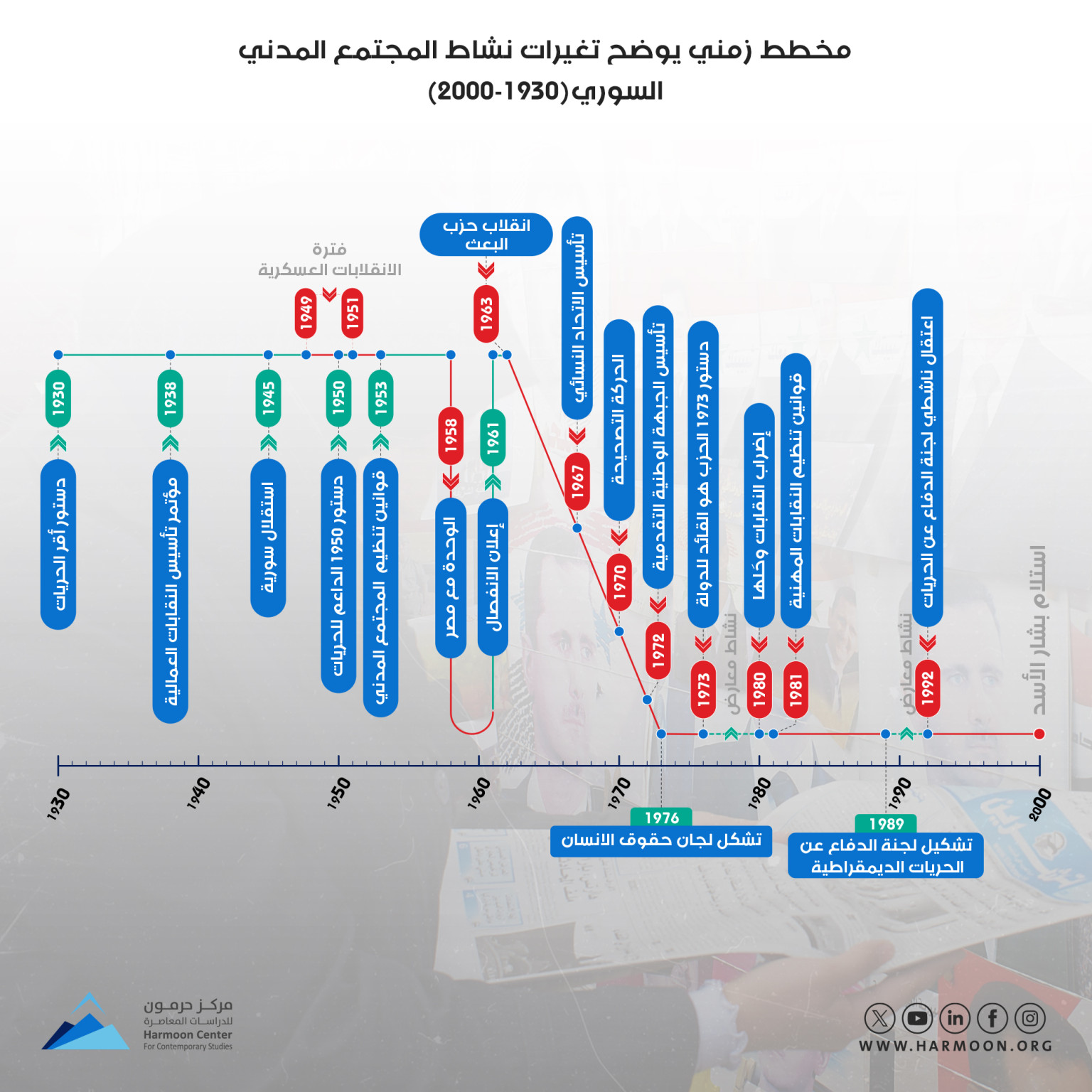 لقراءة تفاصيل التسلسل الزمني لغياب المجتمع المدني في سورية، من خلال رابط الدراسة: https://www.harmoon.org/?p=36321