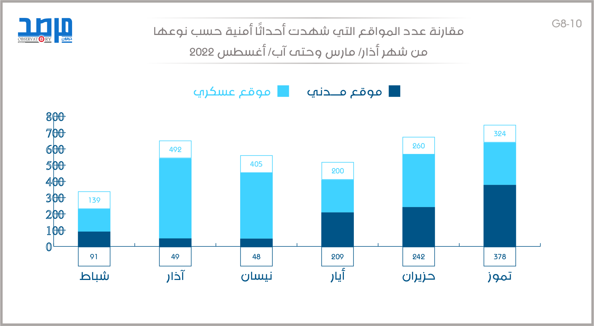 مقارنة عدد المواقع التي شهدت أحداثًا أمنية حسب نوعها من شهر آذار حتى آب 2022