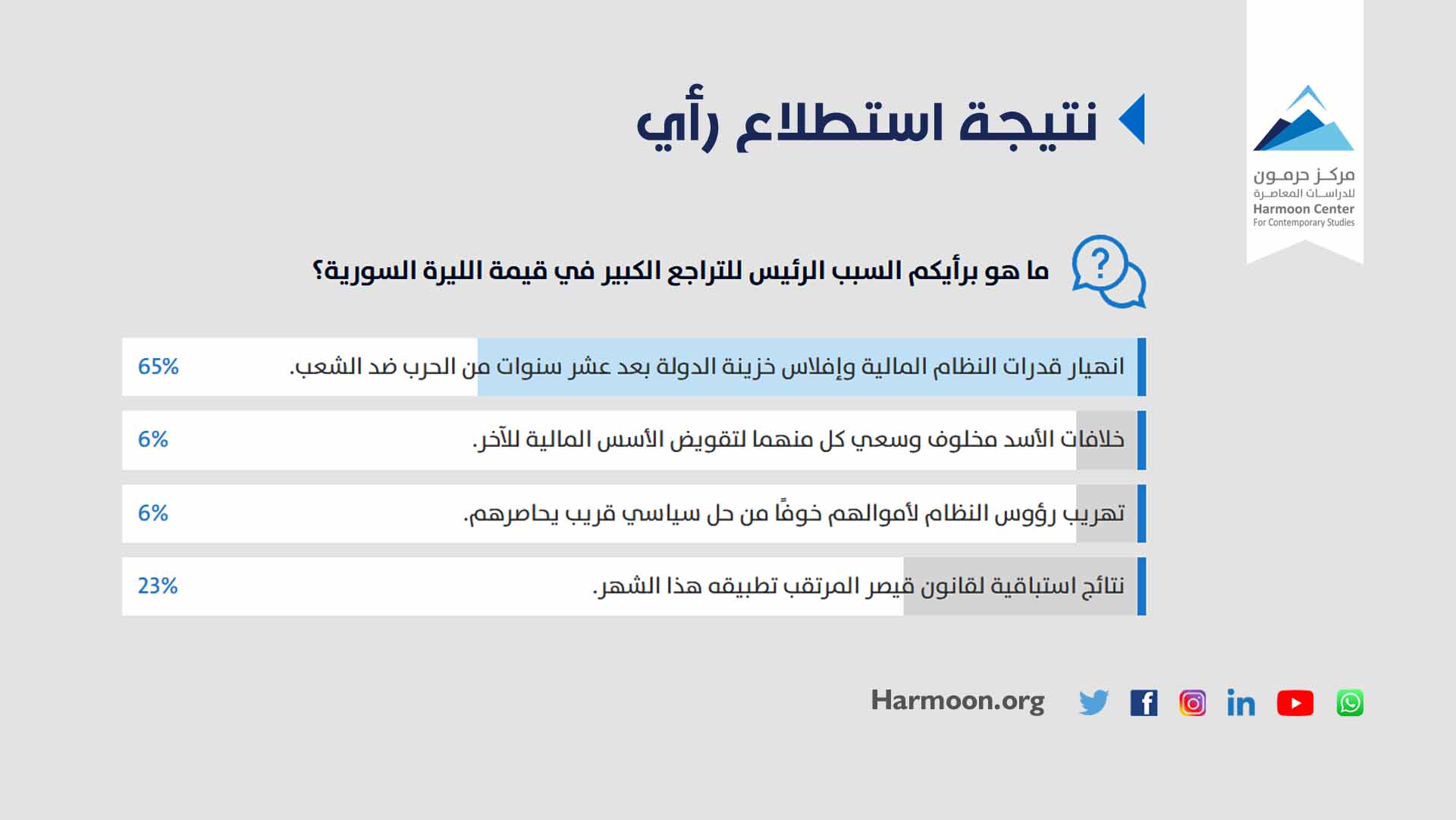يرى 65% من المستطلعين أن السبب الرئيس للتراجع الكبير في قيمة الليرة السورية هو انهيار قدرات النظام المالية وإفلاس خزينة الدولة بعد عشر سنوات من الحرب ضد الشعب.