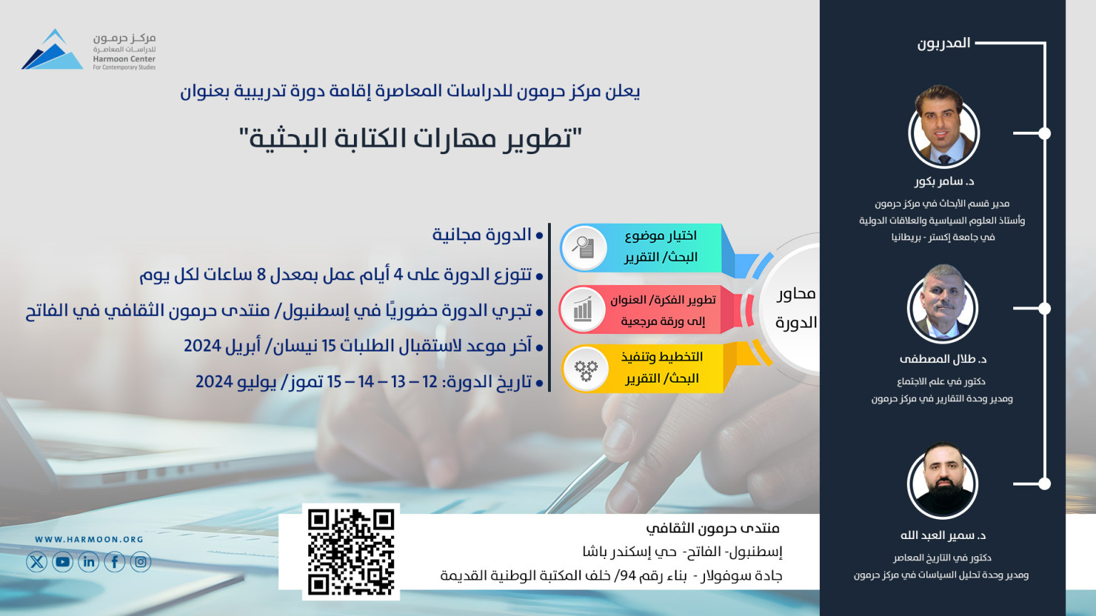 يعلن مركز حرمون للدراسات المعاصرة إقامة دورة تدريبية بعنوان “تطوير مهارات الكتابة البحثية”، تتوزع الدورة على 4 أيام عمل بمعدل 8 ساعات لكل يوم، وتتضمن إعداد بحث مصغّر.