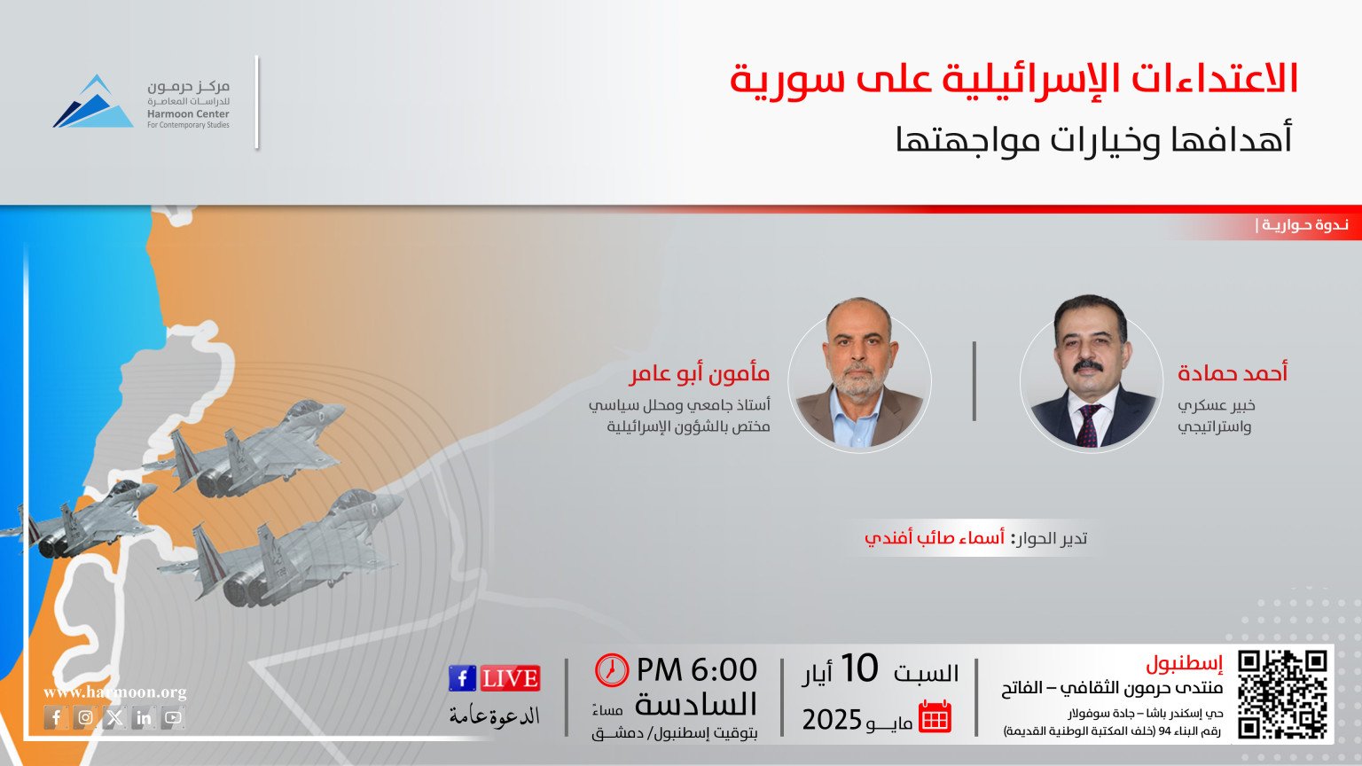 يعقد مركز حرمون للدراسات المعاصرة، يوم السبت 10 أيار/ مايو 2025، الساعة السادسة مساءً بتوقيت إسطنبول، ندوة حوارية بعنوان “الاعتداءات الإسرائيلية على سورية.. أهدافها وخيارات مواجهتها”. يشارك فيها الدكتور مأمون أبو عامر، أستاذ جامعي ومحلل سياسي مختص بالشؤون الإسرائيلية؛ والعقيد أحمد حمادة، خبير عسكري واستراتيجي؛ وتديرها أسماء صائب أفندي، مديرة منتدى حرمون الثقافي في إسطنبول.