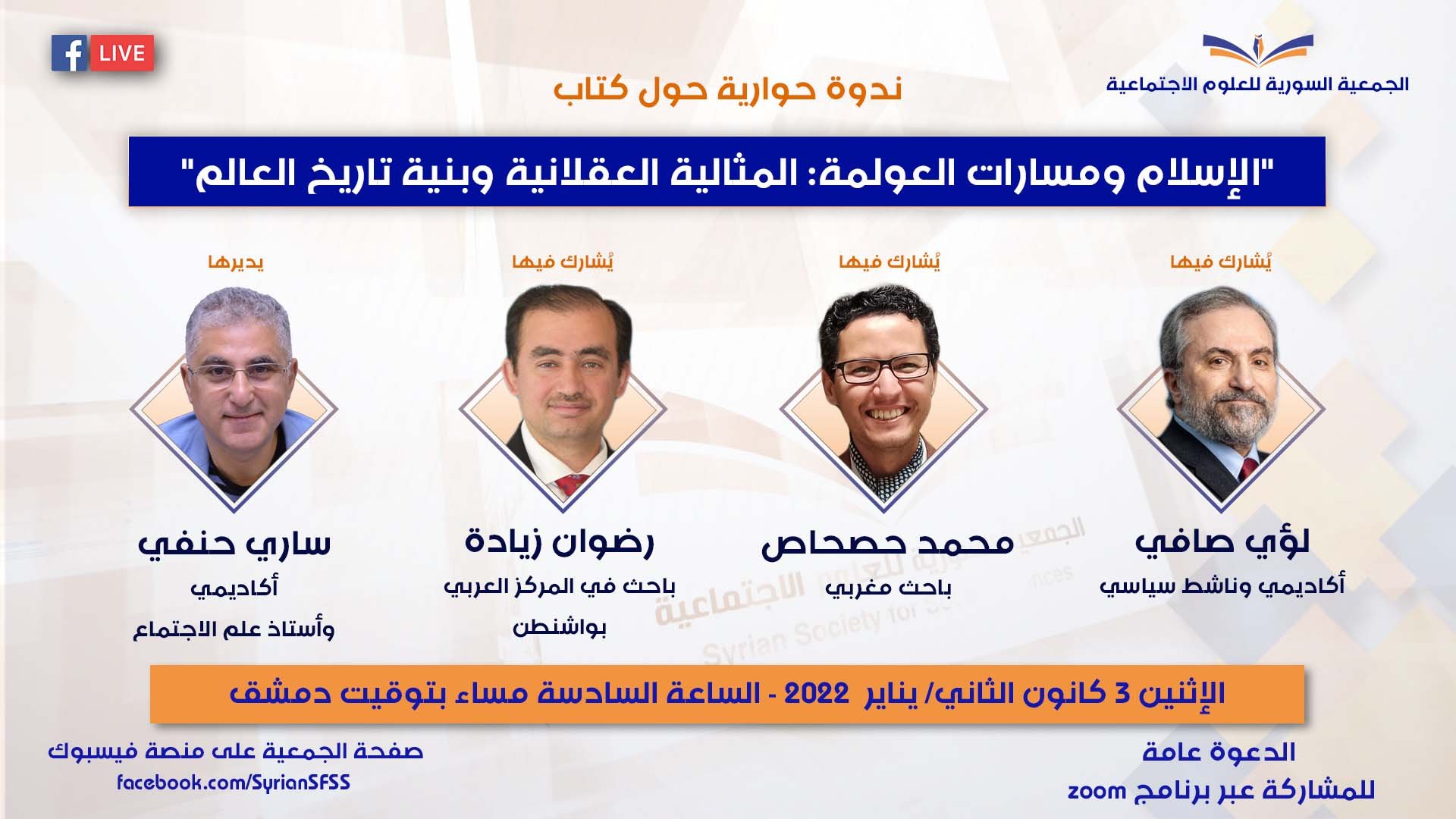 في إطار سلسلة الندوات الشهرية التي تعقدها الجمعية السورية للعلوم الاجتماعية في الإثنين الأول من كل شهر، وتُبثّ مباشرة على وسائل التواصل الاجتماعي، تُعقد ندوة حوارية يوم الإثنين 3 كانون الثاني/ يناير 2022، الساعة السادسة مساء بتوقيت دمشق (السابعة بتوقيت قطر)، حول كتاب: “الإسلام ومسارات العولمة: المثالية العقلانية وبنية تاريخ العالم”.