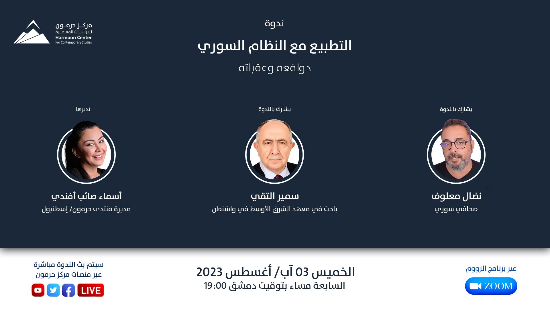 يعقد مركز حرمون للدراسات المعاصرة، يوم الخميس 3 آب/ أغسطس 2023، الساعة السابعة مساءً بتوقيت دمشق، عبر تطبيق (ZOOM)، ندوة بعنوان “التطبيع مع النظام السوري: دوافعه وعقباته”، يُشارك فيها كلّ من سمير التقي، باحث في معهد الشرق الأوسط في واشنطن؛ ونضال معلوف، صحافي سوري؛ وتديرها أسماء صائب أفندي، مديرة منتدى حرمون الثقافي.