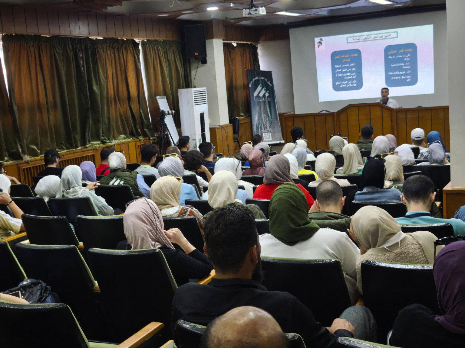 وقدّم إدلبي عرضًا لأبرز أدوات عملية التثبت من الأخبار، وعلامات التمييز بين الخبر الحقيقي والإشاعة، ودور المؤسسات المتخصصة والإعلاميين والمهتمين بالشأن العام على هذا الصعيد.