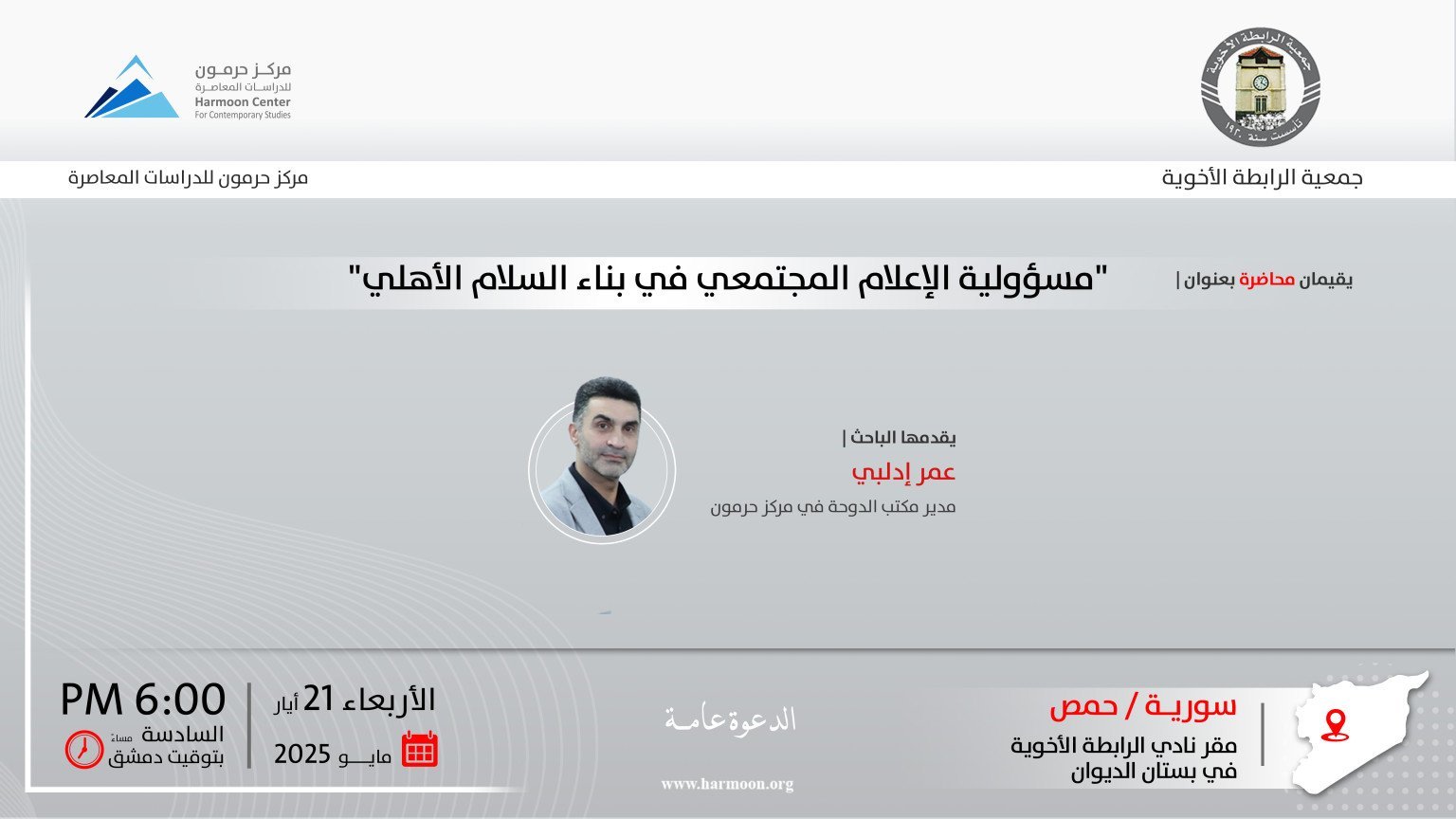يعقد مركز حرمون للدراسات المعاصرة، بالتعاون مع جمعية الرابطة الأخوية في حمص، يوم الأربعاء 21 أيار/ مايو 2025، الساعة السادسة مساءً بتوقيت دمشق، محاضرة بعنوان “مسؤولية الإعلام المجتمعي في بناء السلام الأهلي”.