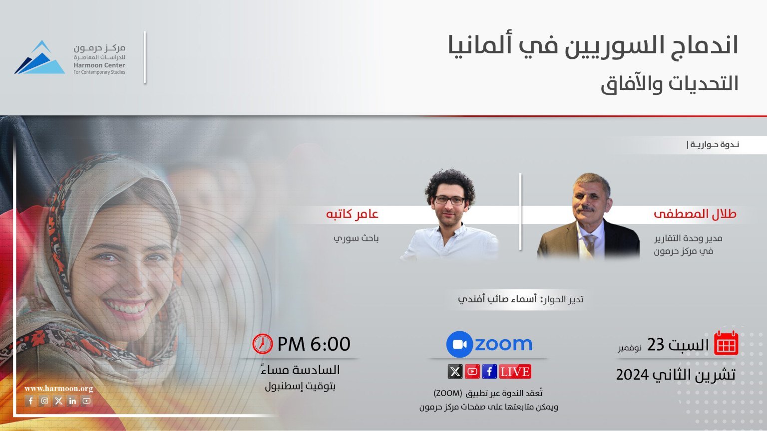 يعقد مركز حرمون للدراسات المعاصرة، يوم السبت 23 تشرين الثاني/ نوفمبر 2024، الساعة السادسة مساءً بتوقيت إسطنبول، ندوة حول الدراسة التي أصدرها المركز بعنوان “اندماج السوريين في ألمانيا: (التحديات والآفاق- دراسة استكشافية)”.