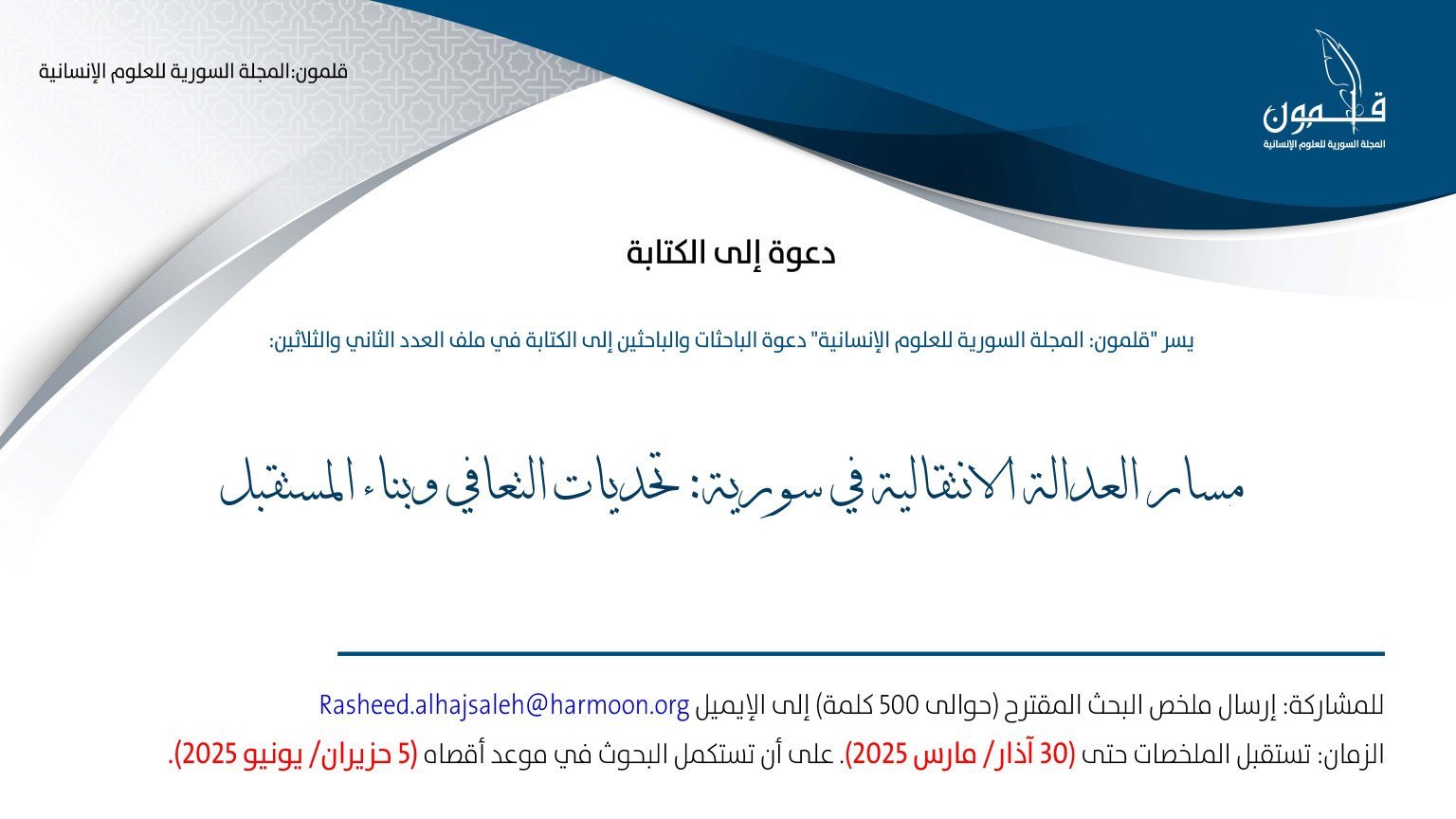 وفي ضوء ما سبق، تدعو (قلمون: المجلة السورية للعلوم الإنسانية) الباحثات والباحثين إلى الكتابة في ملف العدد الثاني والثلاثين عن ((مسار العدالة الانتقالية في سورية: تحديات التعافي وبناء المستقبل))، وذلك ضمن المحاور المقترحة أدناه (يمكن إضافة موضوعات أخرى يرى الباحثات والباحثون أنه من المهم الخوض فيها):