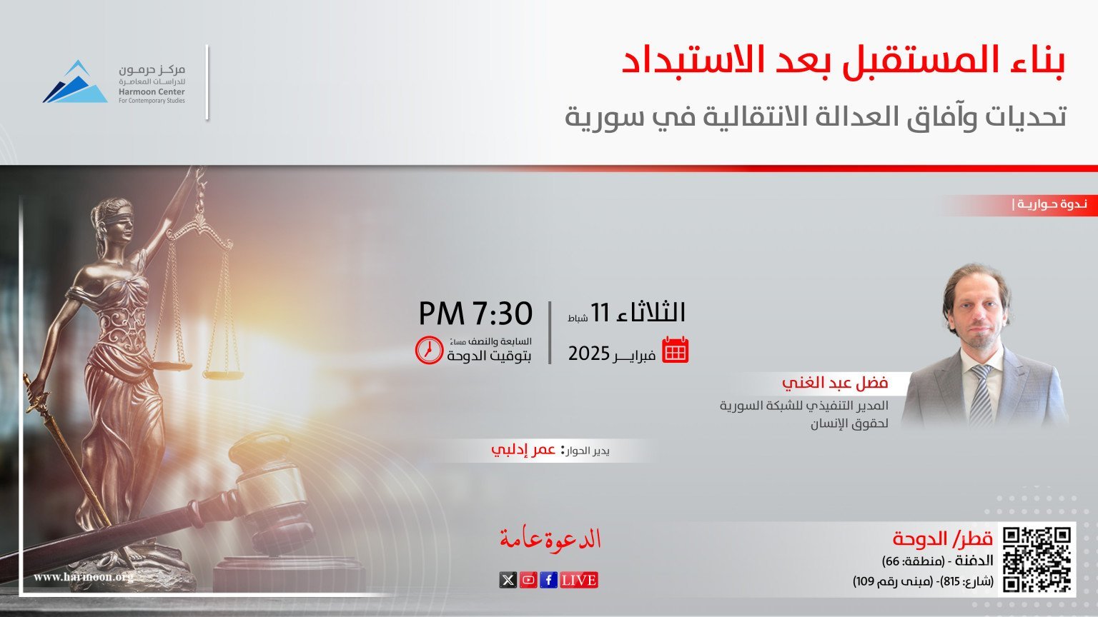 يعقد مركز حرمون للدراسات المعاصرة، يوم الثلاثاء 11 شباط/ فبراير 2025، الساعة السابعة والنصف مساءً بتوقيت الدوحة/ دمشق، في مقرّه بالعاصمة القطرية الدوحة، ندوة حوارية بعنوان: “بناء المستقبل بعد الاستبداد.. تحديات وآفاق العدالة الانتقالية في سورية”، يشارك فيها فضل عبد الغني، المدير التنفيذي للشبكة السورية لحقوق الإنسان.