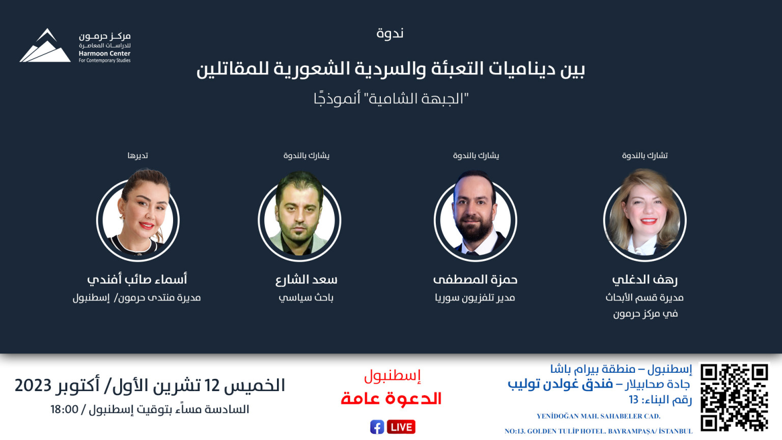 ينظم مركز حرمون للدراسات المعاصرة، يوم الخميس 12 تشرين الأول/ أكتوبر 2023، الساعة السادسة مساءً بتوقيت إسطنبول، ندوة تحت عنوان “بين ديناميات التعبئة والسردية الشعورية للمقاتلين: (الجبهة الشامية) أنموذجًا“، يشارك فيها كل من: رهف الدغلي، مديرة قسم الأبحاث في مركز حرمون للدراسات المعاصرة؛ حمزة المصطفى، مدير تلفزيون سوريا؛ سعد الشارع، باحث سياسي؛ وتُديرها أسماء صائب أفندي، مديرة منتدى حرمون الثقافي في إسطنبول.