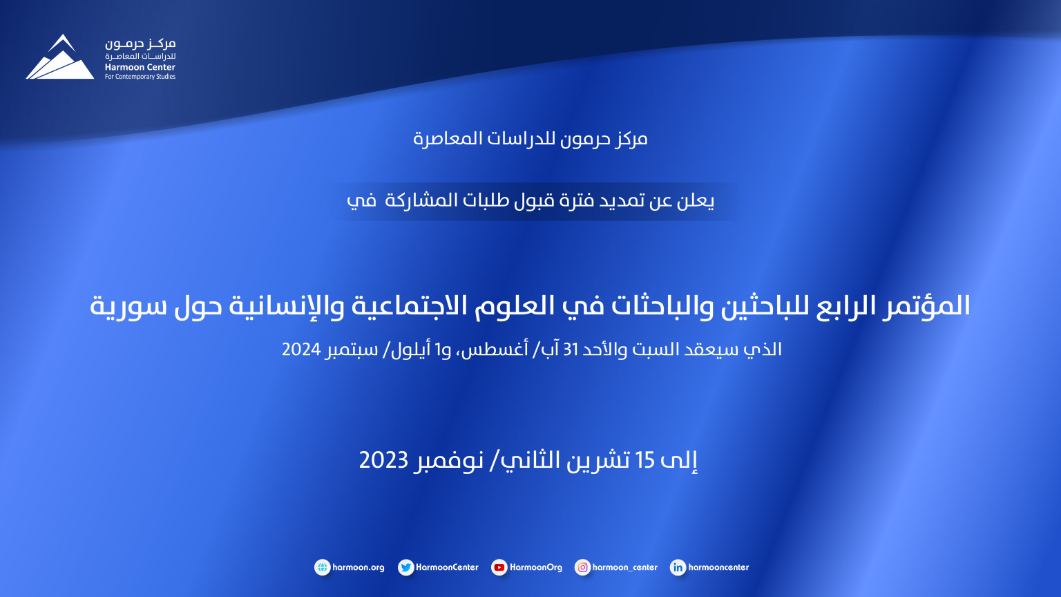 يعلن مركز حرمون للدراسات المعاصرة تمديد فترة تقديم طلبات المشاركة في الدورة الرابعة لمؤتمر الباحثين والباحثات في العلوم الاجتماعية والإنسانية، حتى 15 تشرين الثاني/ نوفمبر 2023. وتعقد الدورة الرابعة للمؤتمر في إسطنبول يومَي السبت والأحد 31 آب/ أغسطس و1 أيلول/ سبتمبر 2024.
