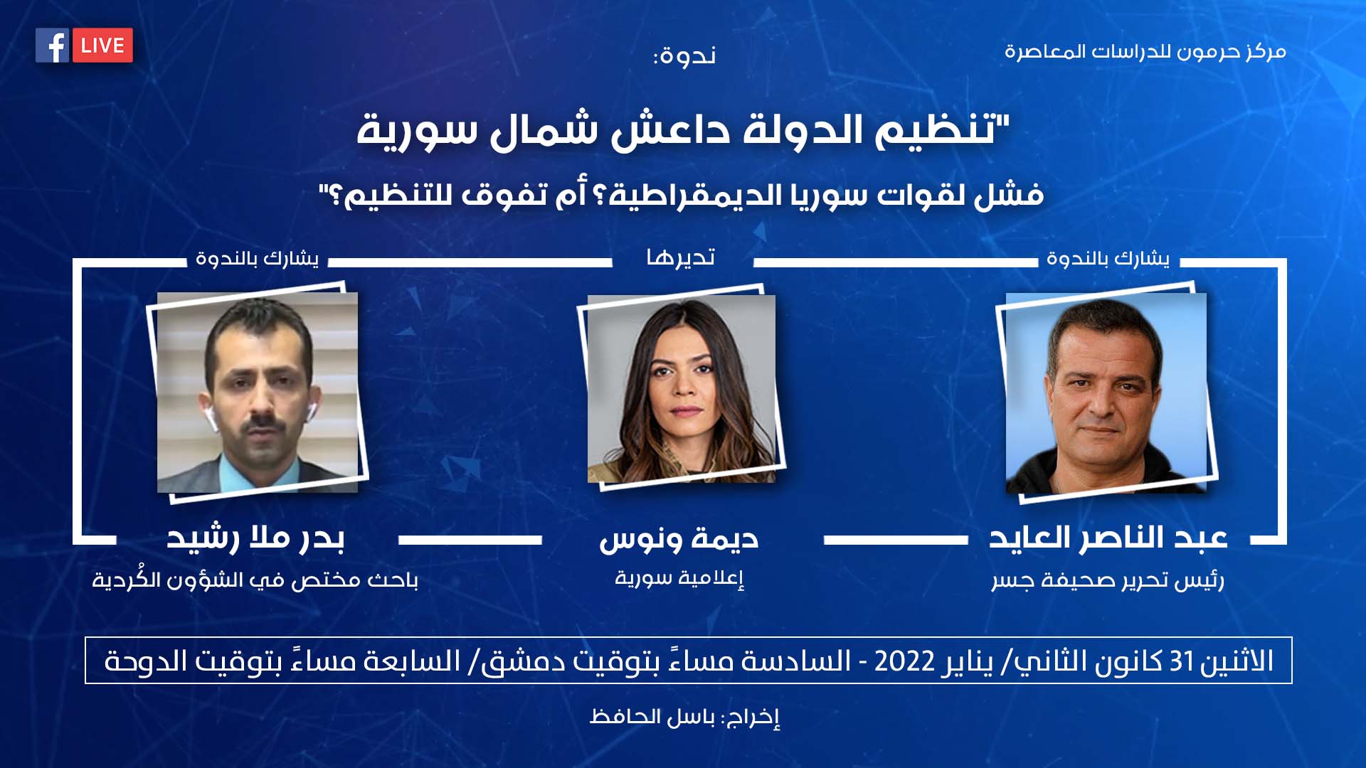 ضمن سلسلة الندوات التي يعقدها مركز حرمون للدراسات المعاصرة، تُقام يوم الاثنين 31 كانون الثاني/ يناير 2022، ندوة بعنوان: “تنظيم الدولة داعش شمال سورية: فشل لقوات سوريا الديمقراطية أم تفوق للتنظيم؟“، وذلك في تمام الساعة السادسة مساءً بتوقيت دمشق، السابعة مساءً بتوقيت الدوحة.