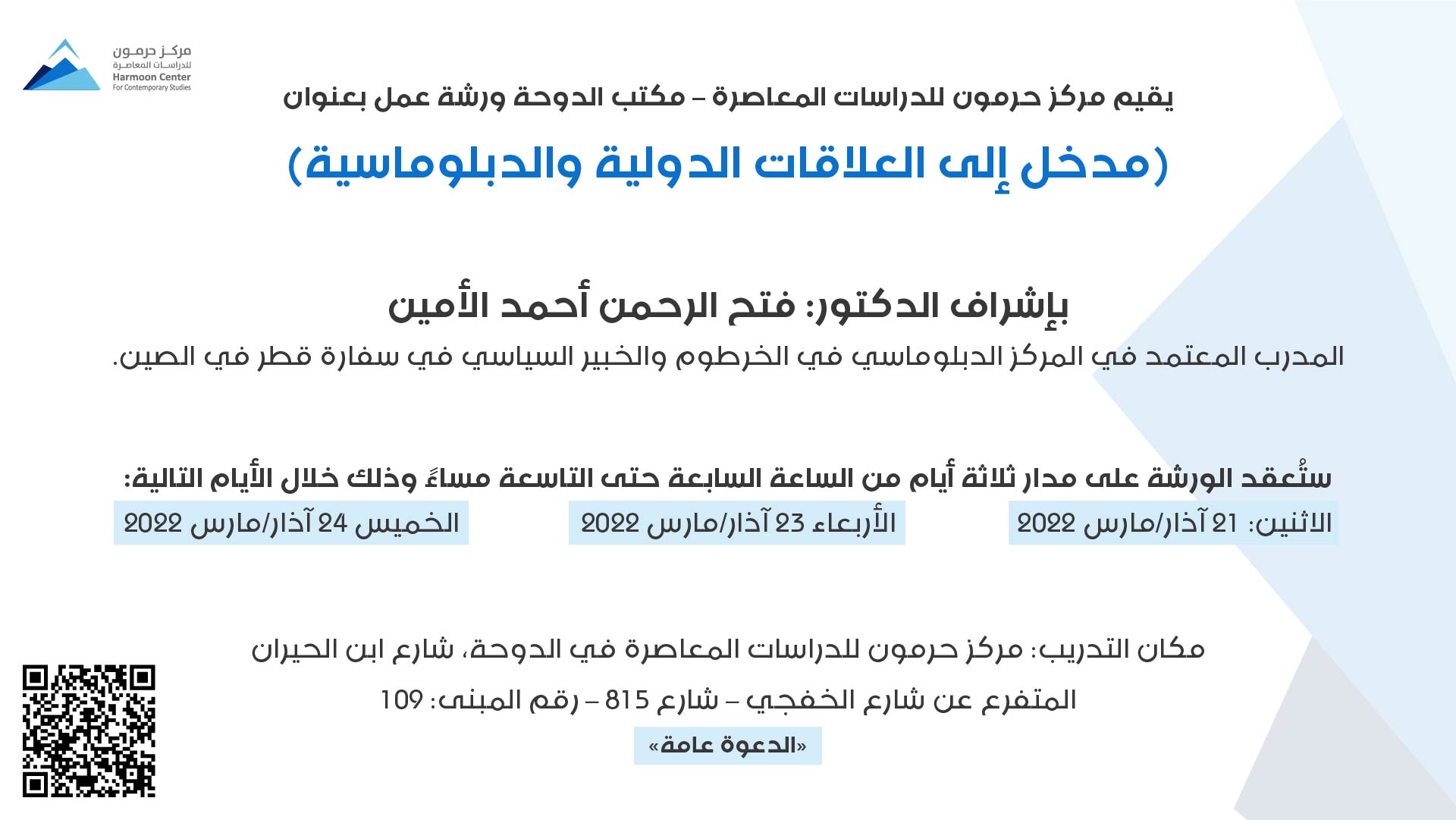 يُقيم مركز حرمون للدراسات المعاصرة – مكتب الدوحة، ورشة عمل بعنوان “مدخل إلى العلاقات الدولية والدبلوماسية“، بإشراف الدكتور فتح الرحمن أحمد الأمين، المدرب المعتمد في المركز الدبلوماسي في الخرطوم والخبير السياسي في سفارة قطر في الصين.