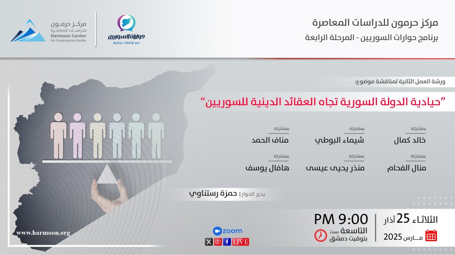 ينظم برنامج “حوارات السوريين” في مركز حرمون للدراسات المعاصرة، يوم الثلاثاء 25 آذار/ مارس 2025، في الساعة التاسعة مساء بتوقيت دمشق، ورشة العمل الثانية (أونلاين)، لمتابعة النقاش في موضوع “حيادية الدولة تجاه العقائد الدينية للسوريين”.