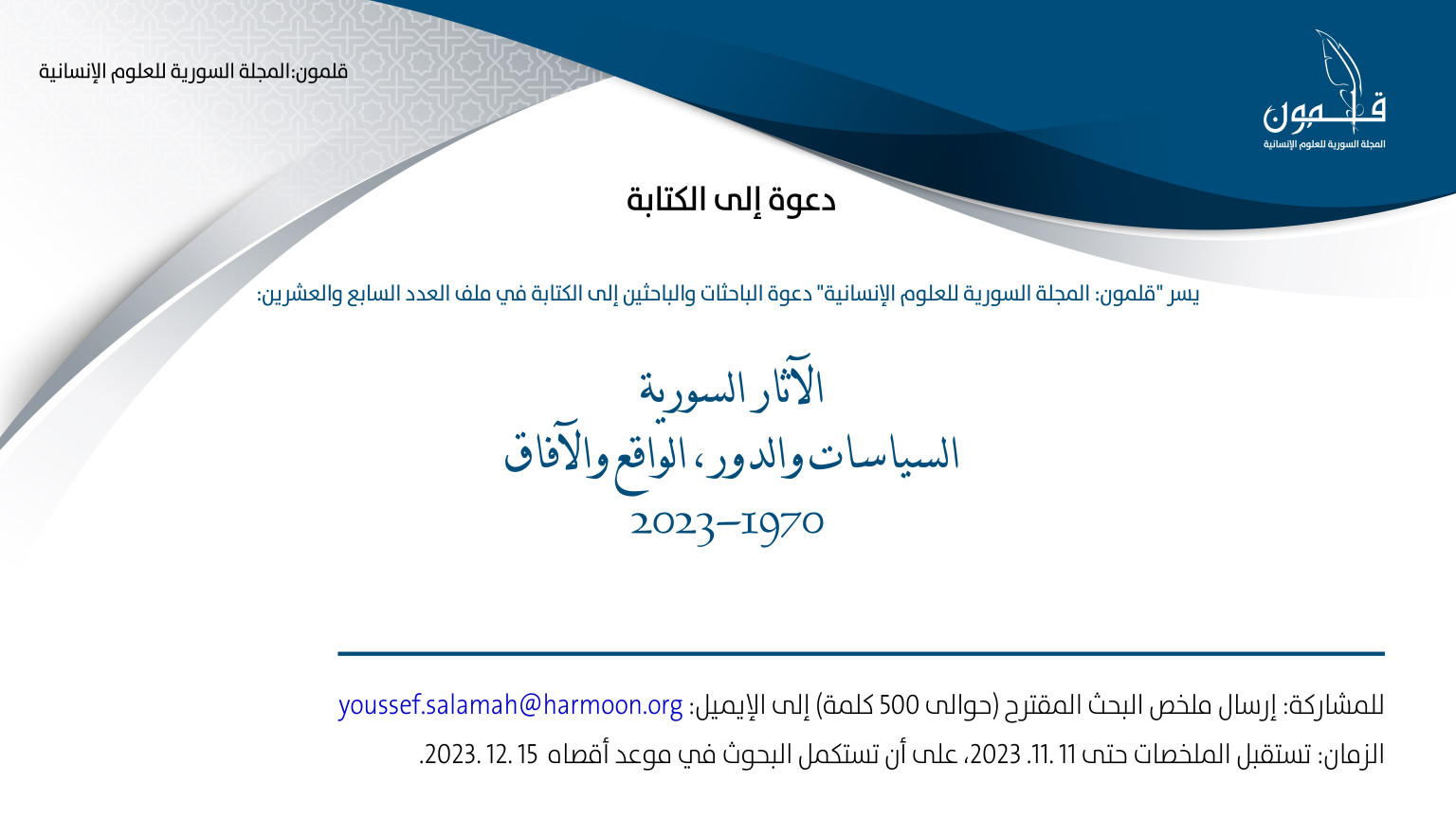 انطلاقاً من أهمية الآثار السورية وضرورة حمايتها بوصفها جزءاً من التاريخ والحضارة الإنسانية، ودورها في بناء الهوية الوطنية وتعزيز الانتماء، وكذلك دورها الحاسم في تعزيز التماسك الاجتماعي وصناعة السلام بين المجتمعات ما بعد الصراع؛ فإن “قلمون: المجلة السورية للعلوم الإنسانية” تفتتح ملف الآثار السورية منذ عام 1970حتى الآن في ملف العدد السابع والعشرين بعنوان: “الآثار السورية: السياسات والدور، الواقع والآفاق 1970-2023″، وتدعو المجلة الباحثات والباحثين إلى الكتابة في هذا الملف ضمن المحاور المقترحة الآتية:
