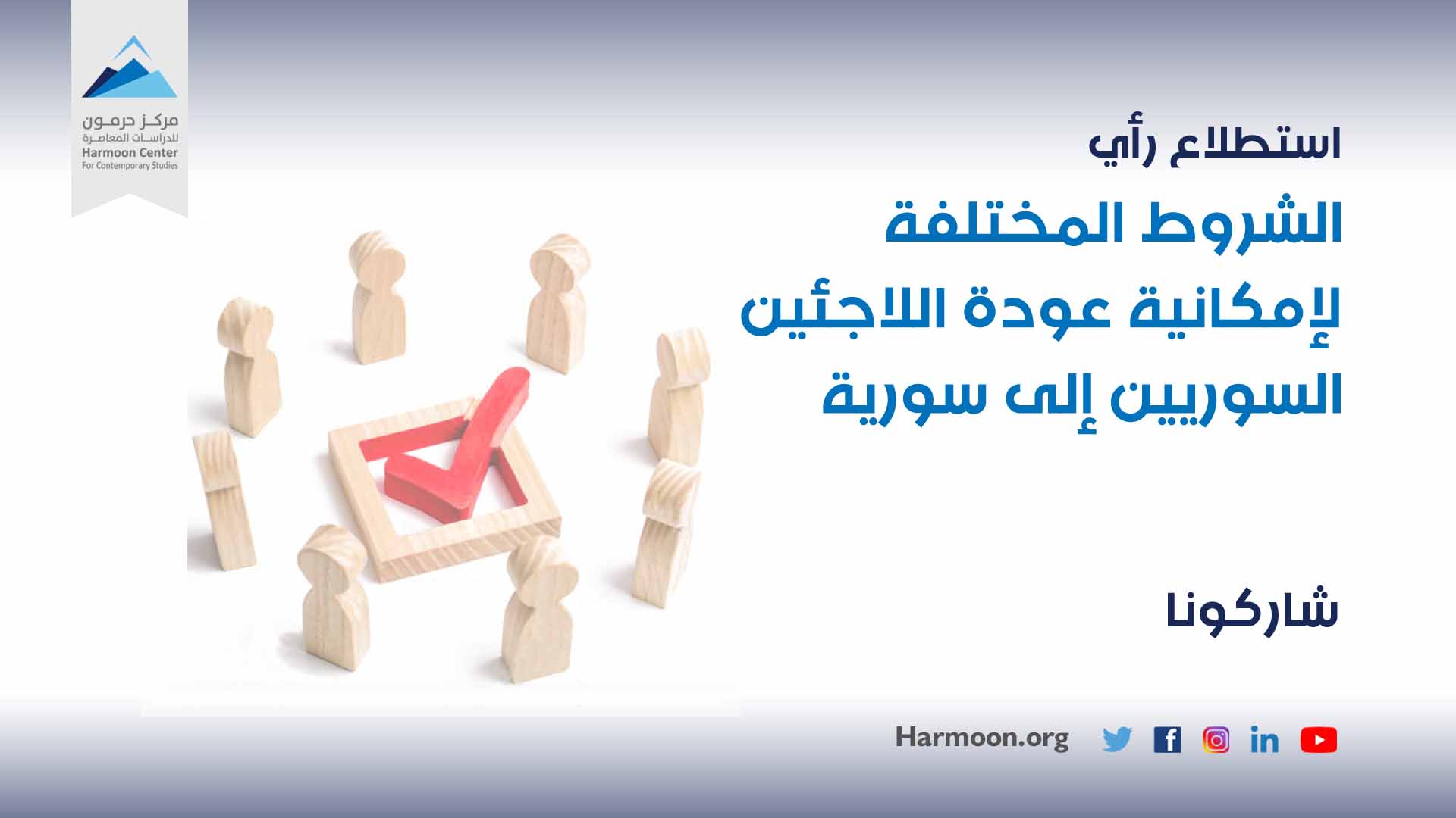 يقوم قسم الدراسات في مركز حرمون للدراسات المعاصرة باستبيان حول موضوع “الشروط المختلفة لإمكانية عودة اللاجئين السوريين إلى سورية”.