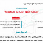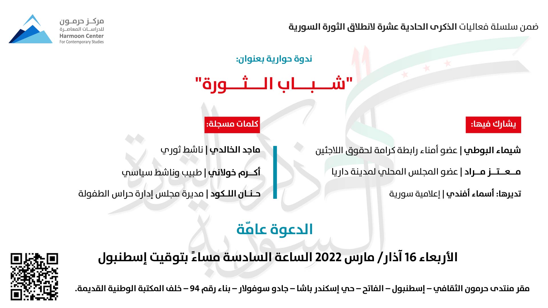 ضمن سلسلة فعاليات الذكرى الحادية عشرة لانطلاق الثورة السورية، ينظّم مركز حرمون للدراسات المعاصرة، يوم الأربعاء 16 آذار/ مارس 2022، الساعة السادسة مساءً بتوقيت إسطنبول، ندوة حوارية بعنوان “شباب الثورة”، يُشارك فيها شيماء البوطي، عضو أمناء رابطة كرامة لحقوق اللاجئين، ومعتز مراد، عضو المجلس المحلي لمدينة داريا، وتُديرها أسماء أفندي، إعلامية سورية.