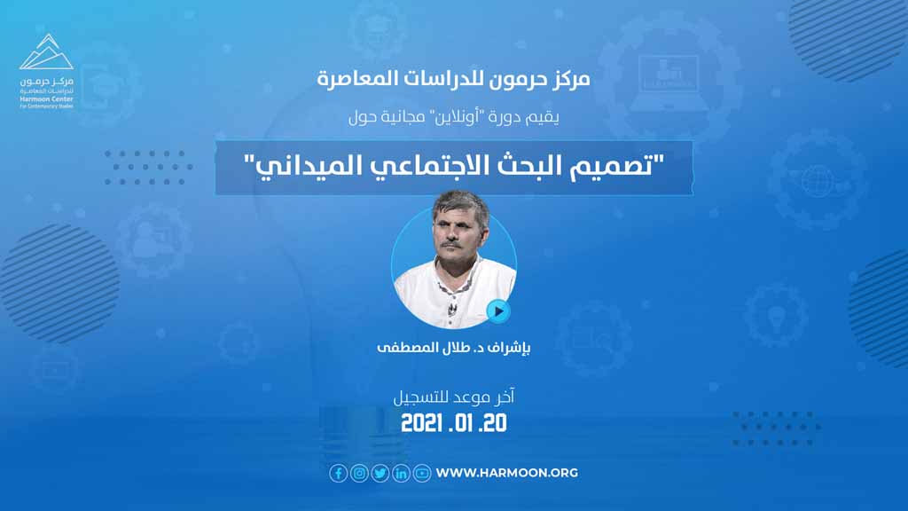 يُقيم مركز حرمون للدراسات المعاصرة دورة تدريبية حول (تصميم البحث الاجتماعي الميداني)، تبدأ في 25 كانون الثاني/ يناير 2021، وتستمر خمسة أيام، يقدّمها ويشرف عليها طلال المصطفى، الدكتور في علم الاجتماع، والباحث في قسم الدراسات في مركز حرمون.