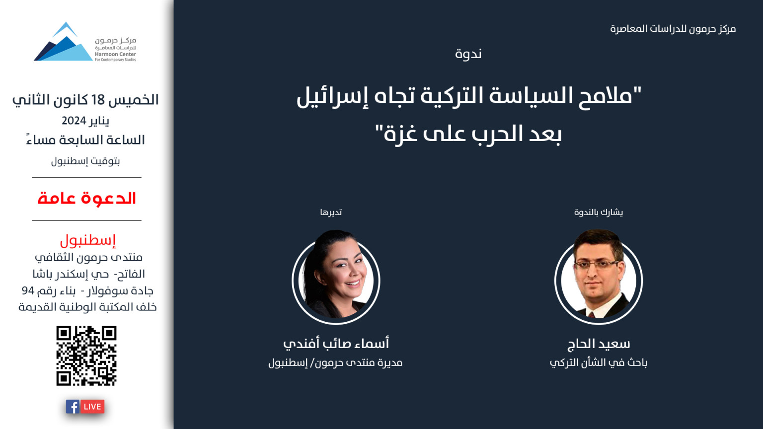 يعقد مركز حرمون للدراسات المعاصرة، الخميس 18 كانون الثاني/ يناير 2024، الساعة السابعة مساءً بتوقيت إسطنبول، ندوة حوارية بعنوان “ملامح السياسة التركية تجاه إسرائيل بعد الحرب على غزة“، يشارك فيها سعيد الحاج، باحث في الشأن التركي، وتديرها أسماء صائب أفندي، مديرة منتدى حرمون الثقافي في إسطنبول.