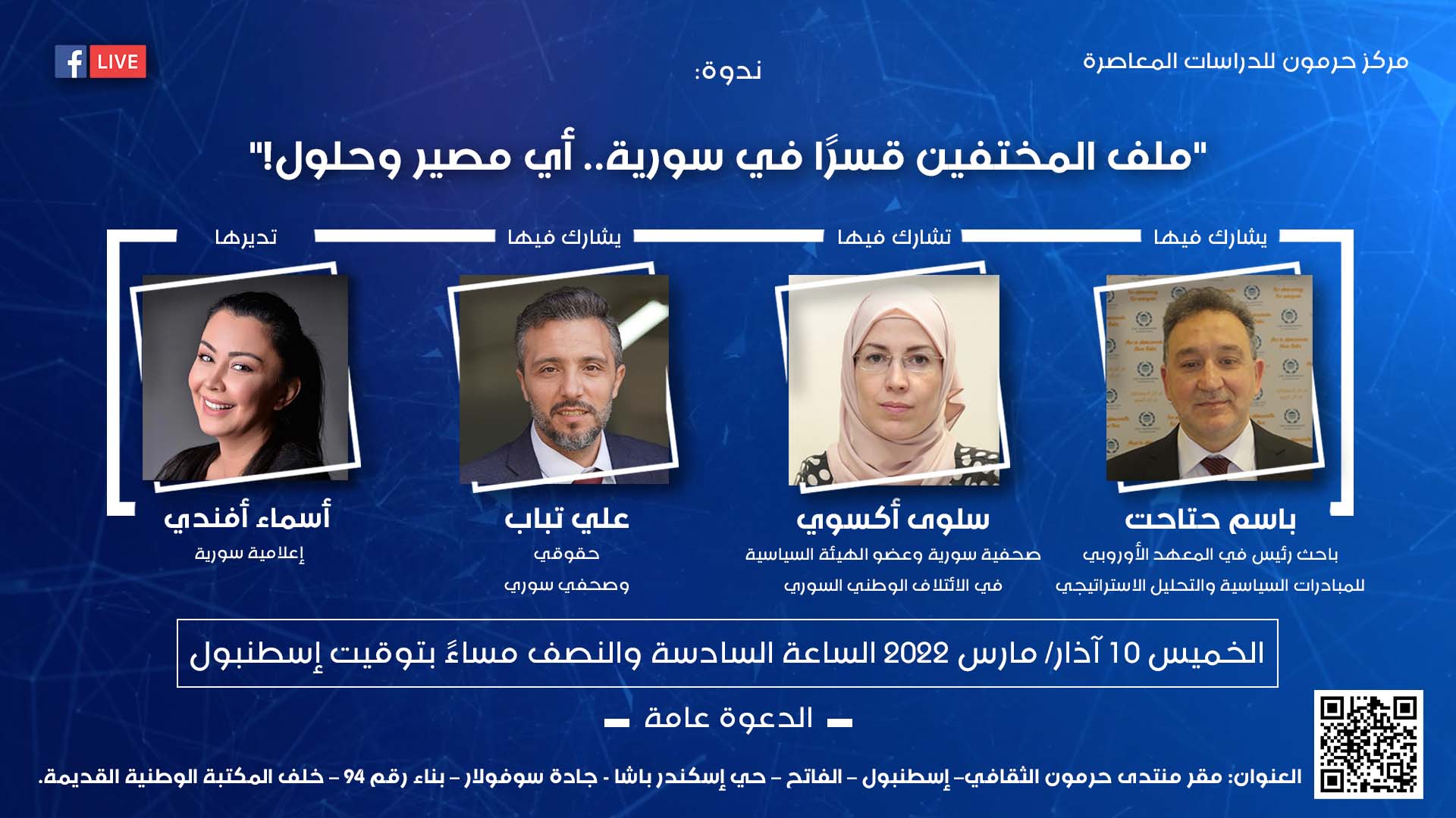 يعقد مركز حرمون للدراسات المعاصرة، يوم الخميس 10 آذار/ مارس 2022، الساعة السادسة والنصف مساءً بتوقيت إسطنبول، ندوة بعنوان “ملف المختفين قسرًا في سورية.. أي مصير وحلول!“، يُشارك فيها باسم حتاحت، باحث رئيس في المعهد الأوروبي للمبادرات السياسية والتحليل الاستراتيجي، وسلوى أكسوي، صحفية سورية وعضو الهيئة السياسية في الائتلاف الوطني السوري، وعلي تباب، حقوقي وصحفي سوري، وتُديرها أسماء أفندي، الإعلامية السورية.