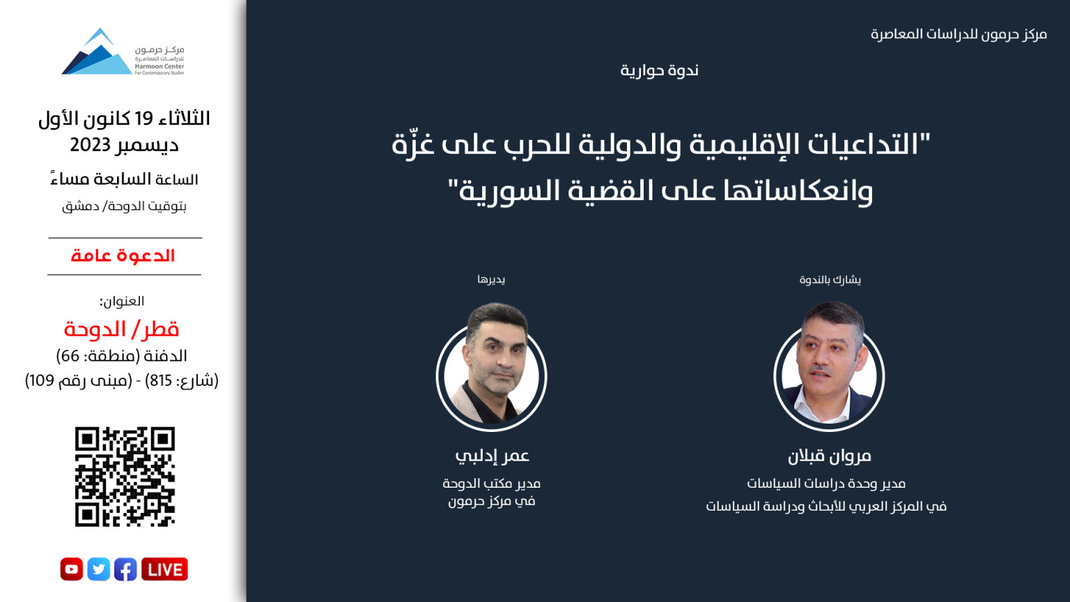 يعقد مركز حرمون للدراسات المعاصرة، يوم الثلاثاء 19 كانون الأول/ ديسمبر 2023، الساعة السابعة مساءً بتوقيت الدوحة/ دمشق، ندوة حوارية بعنوان “التداعيات الإقليمية والدولية للحرب على غزة وانعكاساتها على القضية السورية“.
