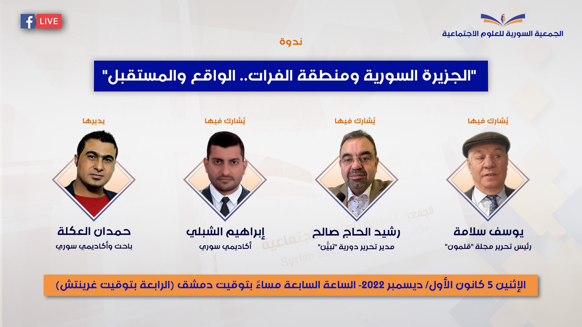 في إطار سلسلة الندوات الشهرية التي تعقدها الجمعية السورية للعلوم الاجتماعية، في الاثنين الأول من كل شهر، وتبثّها مباشرة على وسائل التواصل الاجتماعي، تُعقد ندوة يوم الاثنين 5 كانون الأول/ ديسمبر 2022، الساعة السابعة مساء بتوقيت دمشق- إسطنبول، (الخامسة بتوقيت أوروبا، والرابعة بتوقيت غرينتش) بعنوان: الجزيرة السورية ومنطقة الفرات – الواقع والمستقبل.